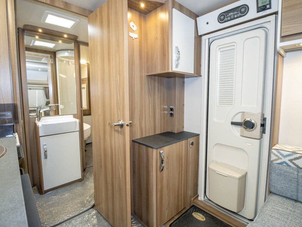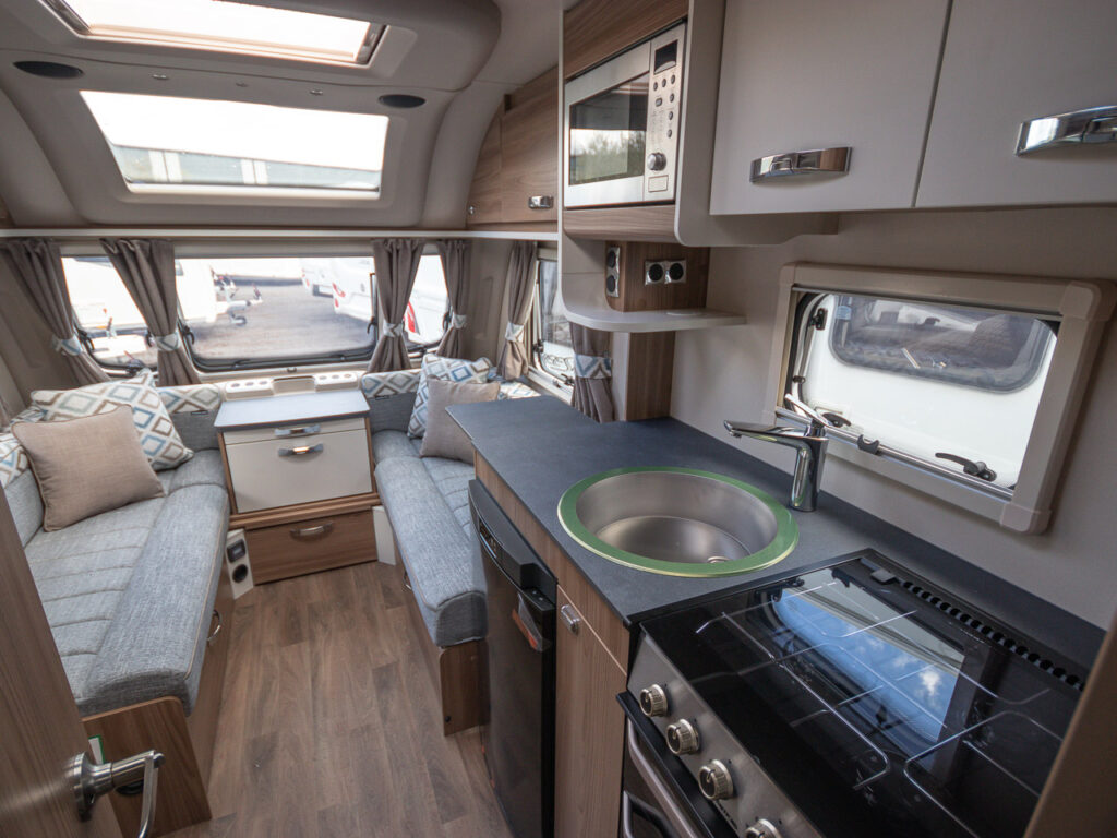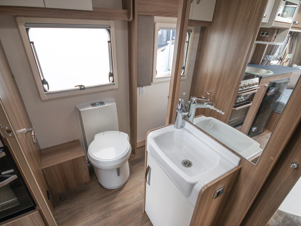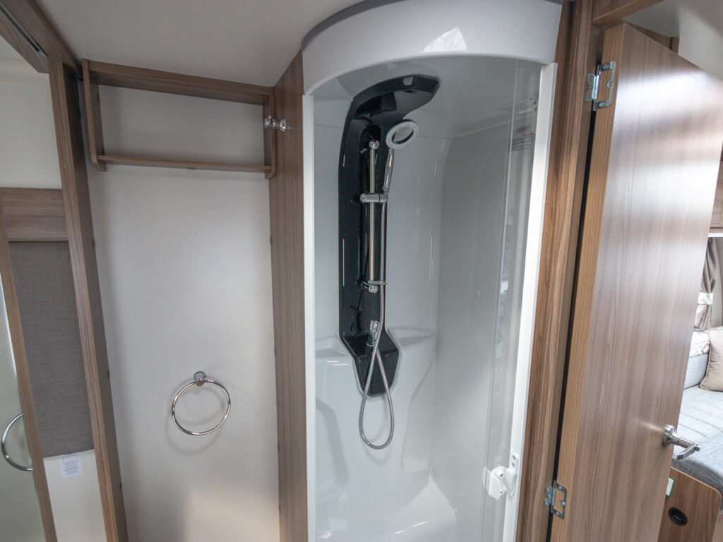 chrome effect grab handles and a window in the entrance door which helps to add light to the centre of the caravan, new EcoCamel showerhead, and a micro Heki rooflight.