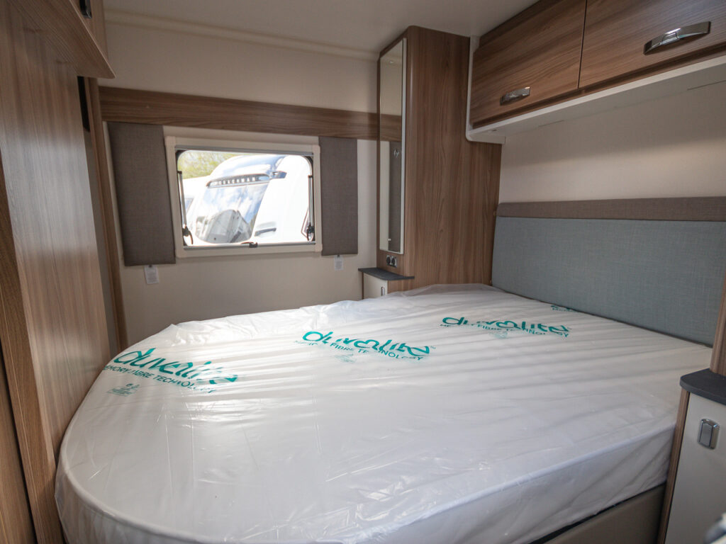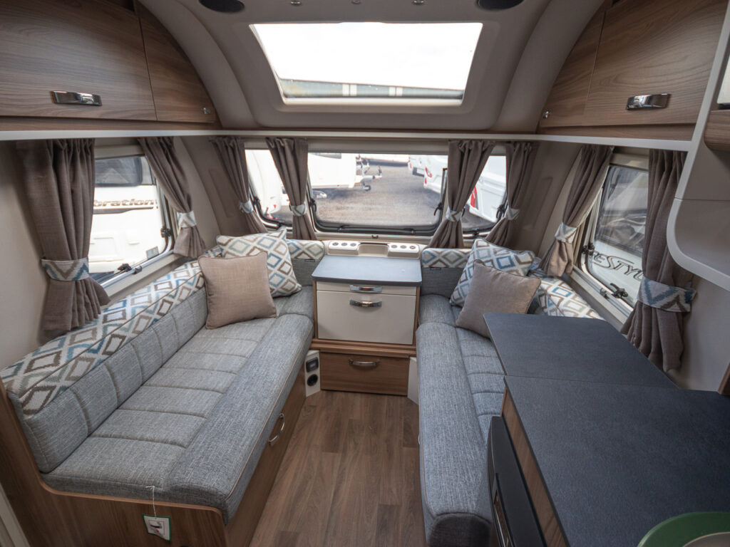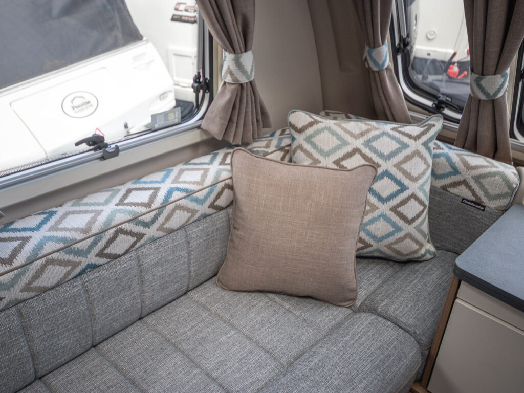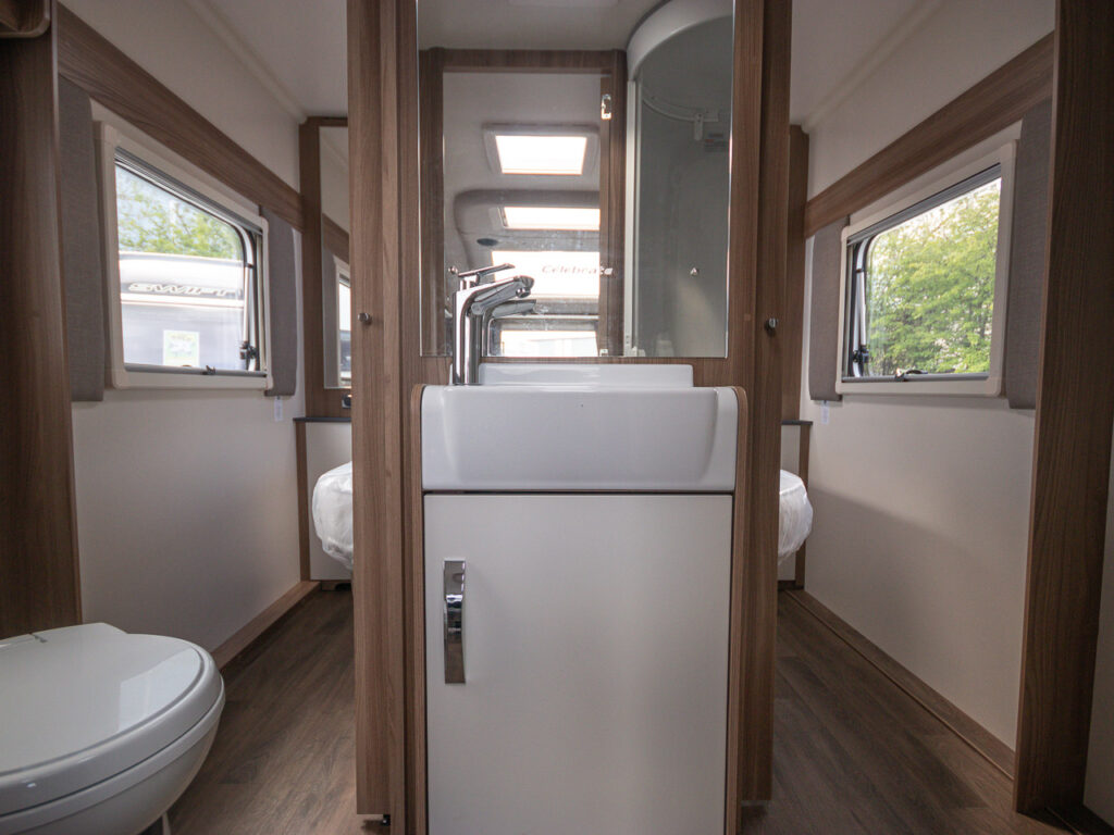 chrome effect grab handles and a window in the entrance door which helps to add light to the centre of the caravan, new EcoCamel showerhead, and a micro Heki rooflight.